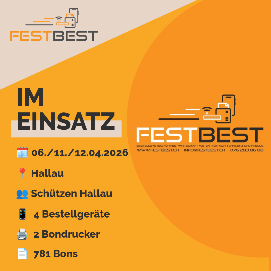 Beim diesjährigen Schwabenkrieg-Erinnerungsschiessen der Schützen Hallau kam das Bestellsystem FESTBEST erfolgreich zum Einsatz, um die Festwirtschaft effizient zu organisieren. Die Gäste konnten ihre Speisen und Getränke direkt bei den Service-Helfern vor Ort bestellen. FESTBEST übernahm dabei die zentrale Erfassung und Verwaltung der Bestellungen, sodass die Bestellungen reibungslos und zeitnah serviert werden konnten.