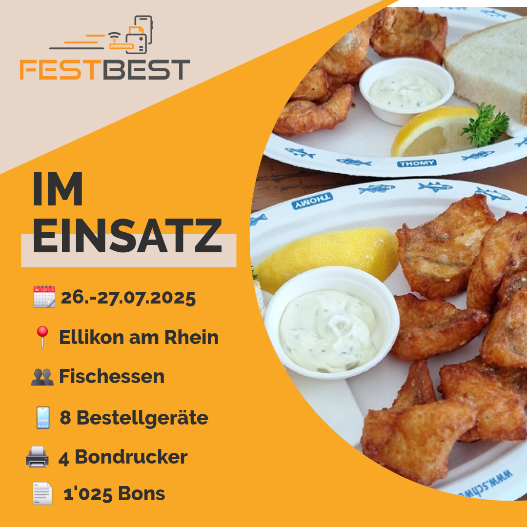 Der erste Einsatz nach der kurzen Sommerferienpause gehörte den Pontonieren Ellikon. Trotz viel Regen, genossen viele Gäste feinsten Fisch direkt am Rhein. Der Service und die Küche war dank dem einfachen Handling von FESTBEST- Bestellsystem für Festwirtschaften hochzufrieden. Die Gäste wurden ebenfalls speditiv bedient und serviert.