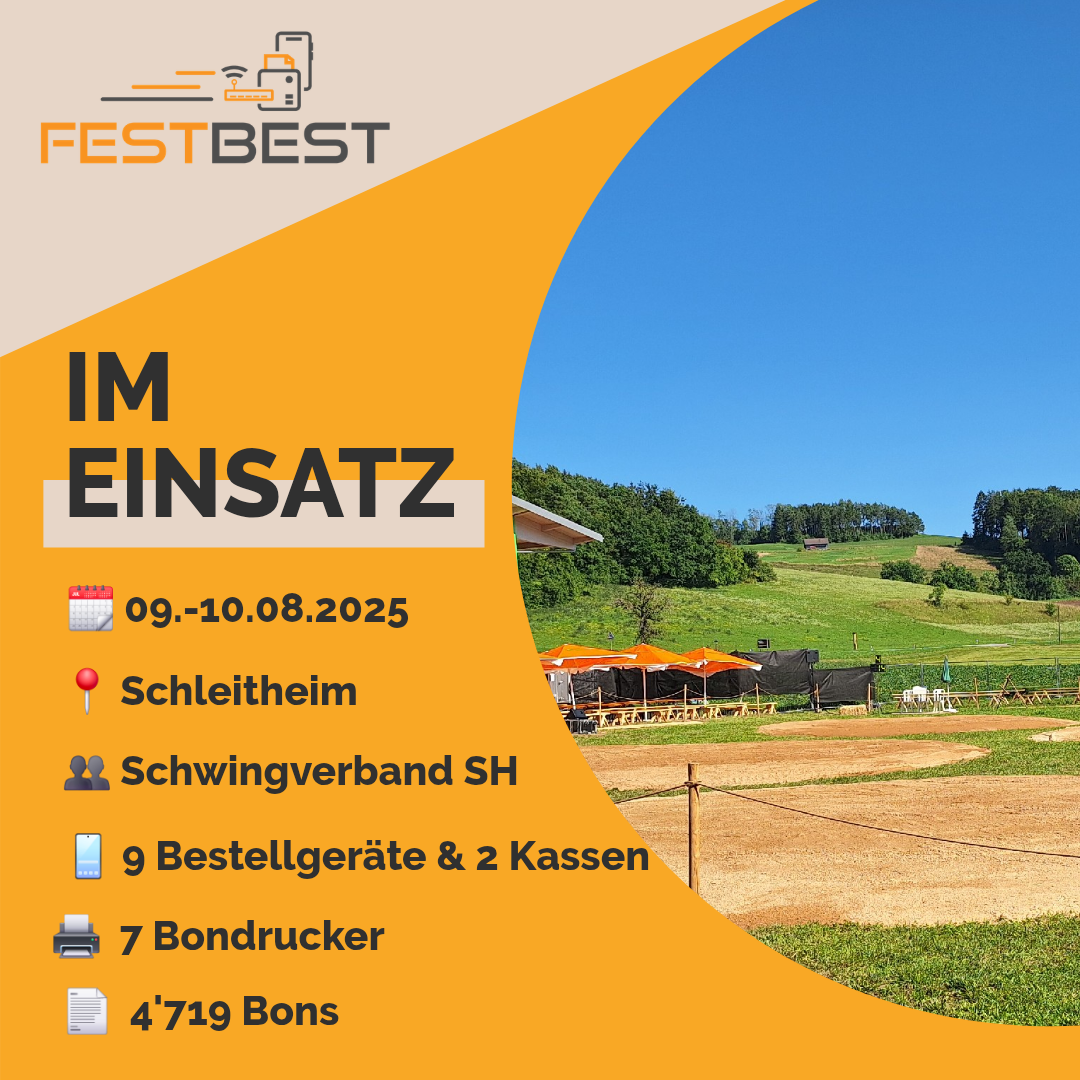 Am Wochenende vom 9. und 10 August 2025 wurde in Schleitheim fleissig geschwizt. Bei Sonnenschein und grosser Hitze fand nämlich das kantonale Schwingfest statt und die Festwirtschaft wurde durch FESTBEST - Bestellsystem unterstützt.