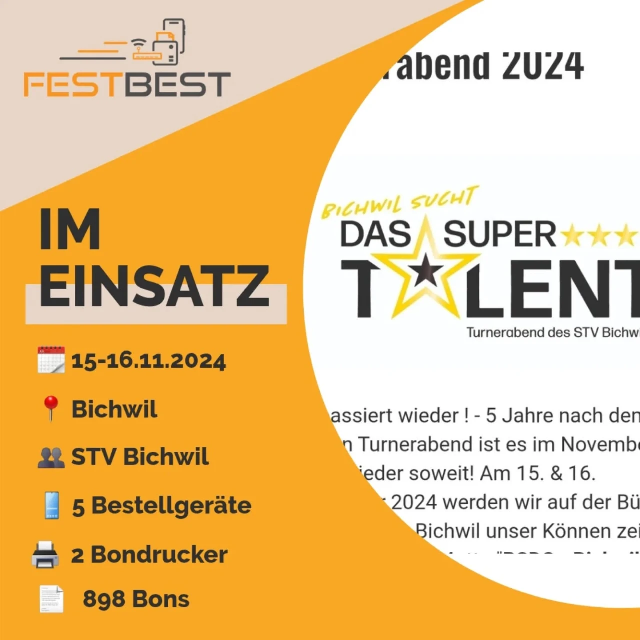 Nach 5 Jahren Pause präsentierte der STV Bichwilendlich wieder einmal eine Turnunterhaltung. Für mehr Freude und Effizienz wurde auf FESTBEST in der Festwirtschaft gesetzt. Für das Vertrauen und die gute Zusammenarbeit bedanken wir uns recht 🧡🙏
