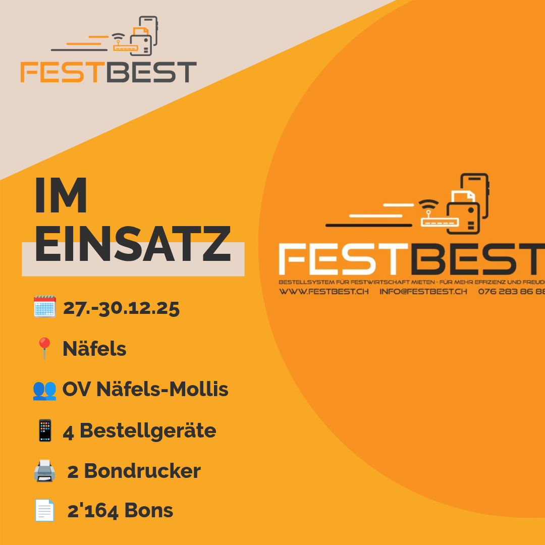 Das Bestellsystem von FESTBEST wurde vom 27.12. - 30.12.2025 bei der Kleintierausstellung des OV Näfels-Mollis eingesetzt. Dadurch wurde die Festwirtschaft sehr effizient geführt und das ganze Service Team hatte grossen Spass an der Arbeit.