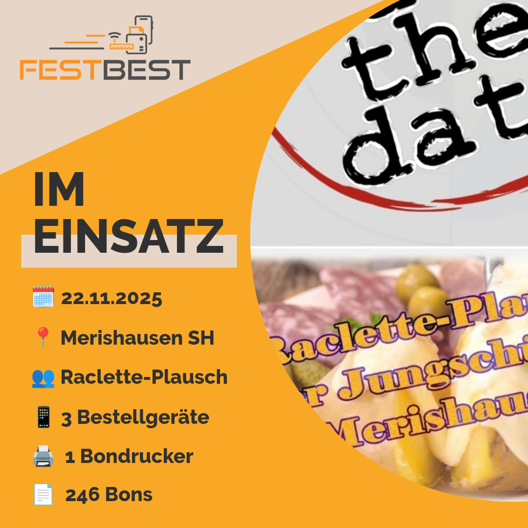 Beim Raclette-Plausch, zugunsten der Jungschützen Merishausen, kam auch in diesem Jahr wieder FESTBEST zum Einsatz. So wurden das Abkassieren der Konsumationen zum Kinderspiel.